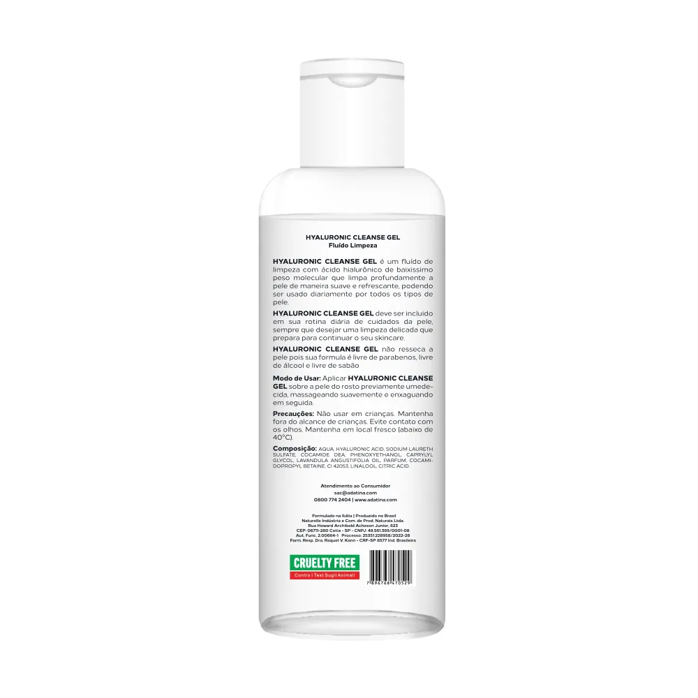 O Hyaluronic Cleanse Gel é um fluido de limpeza facial inovador, formulado com Ácido Hialurônico de Baixíssimo Peso Molecular, que limpa profundamente sem ressecar, hidrata intensamente e ajuda a preencher rugas e linhas de expressão. Ideal para todos os tipos de pele, inclusive oleosas e acneicas, sua textura leve e refrescante proporciona uma sensação de frescor imediato. Livre de parabenos, álcool e óleo mineral, é vegano, cruelty-free e seguro para gestantes.